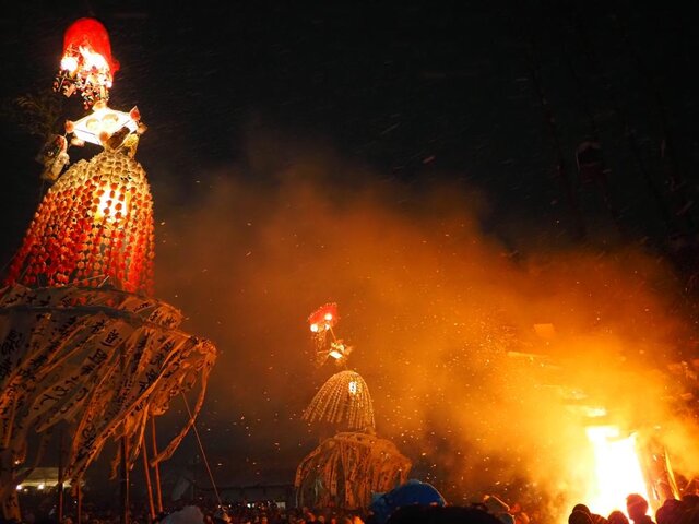 見どころは、1月15日の夜に行われる「火の戦い」。お祭りのために造られた巨大な社殿に火を付けようとする村人と、それを守る厄年の男たちとの激しい攻防が繰り広げられます。