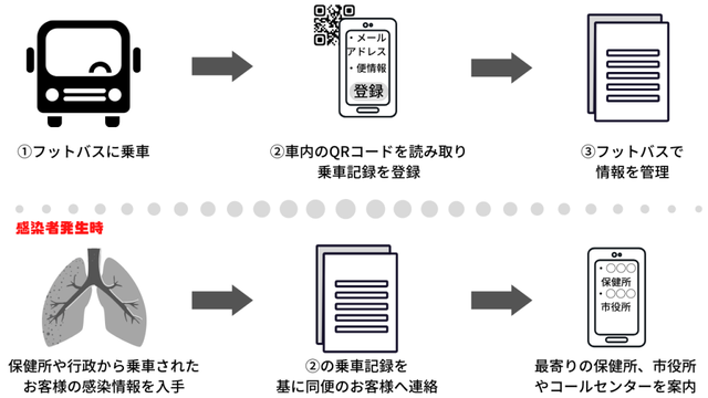 万が一、バス車内にて、コロナウイルスに罹患しているお客様が乗車したことが発覚した場合、他のお客様への連絡(感染者追跡)が必要です。