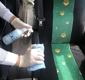 運行終了ごとに、「ヘッドレスト」「ひじ掛け」「背もたれ」「座面」「カーテン」などに「ルネキャット」や「次亜塩素酸水」を吹きかけて、バス車内の消毒作業を徹底して行っています。