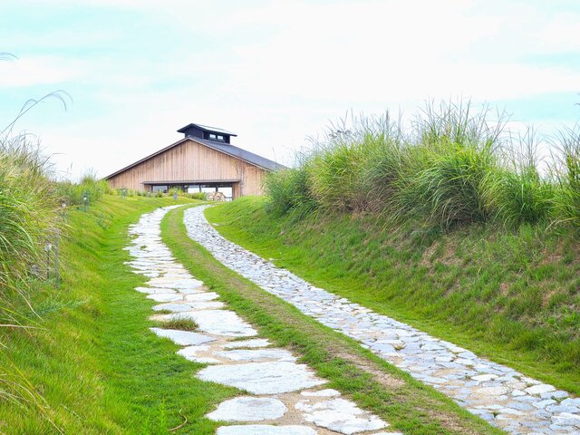 カフェへと続く「時の小径」というメインアプローチは、庵治石が敷き詰められたスロープになっていて、歩いていくと徐々に目の前に瀬戸内海の壮大な景色や小豆島が広がる設計が特徴です。
