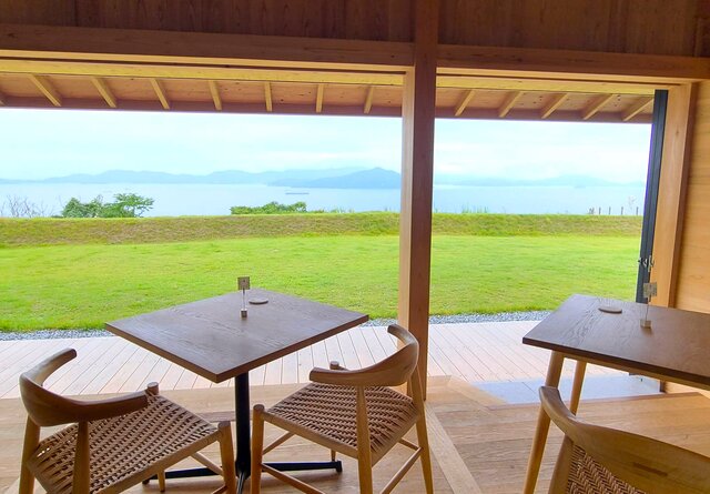 窓際の席からは、まるで屏風絵のように絶妙なバランスで切り取られた瀬戸内海の絶景が楽しめ、どの席からでも美しい景色と開放的な空間が味わえます。
