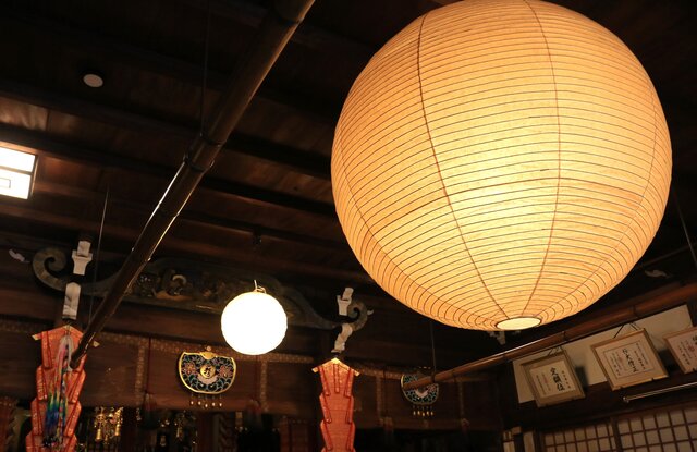 本堂に吊り下げられた直径約1.2メートルの球体の照明「AKARI」は「光の彫刻」シリーズの最初の作品で、寺全体には計17点もの「AKARI」が設置されています。