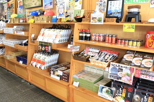 地元農家が朝採りした新鮮な野菜や果物、香川ならではの銘菓やお酒、伝統工芸品などが並び、特にうどんのお土産が豊富に揃っているのが特徴です。