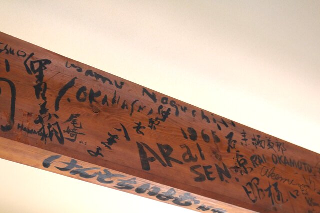 1階カウンターの梁には、イサム・ノグチ、流政之、和田邦坊など、香川ゆかりの著名な芸術家たちのサインが刻まれているので、探してみてください。