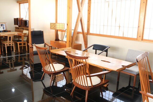 1階はギャラリーshopや喫茶コーナーで、実際に家具に座り、そのデザインと座り心地を体感できます。