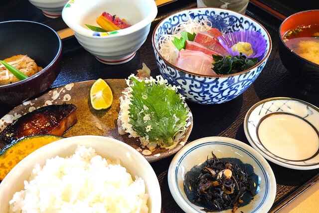 特製タレで味付けしたハマチが山盛りの「ハマチづけ丼」や、地元の名所・五剣山をイメージして魚介や旬の野菜をたっぷり盛り込んだボリューム満点の天丼「五剣山」が人気メニューです。