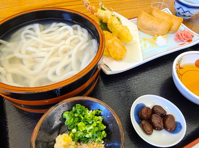 うどんは釜ぶっかけ(※登録商標)やざるうどん、釜上げうどんなどの定番メニューはもちろん、カレーうどんなど種類も豊富で、特に天ぷらやいなり寿司がセットになった定食が人気。