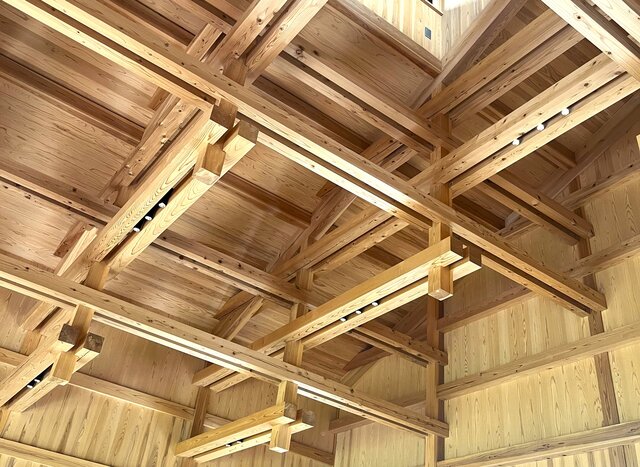 店内には無垢のスギ材がふんだんに使われていて、天井を見上げると4寸角のスギ材でできた「挟み梁」が目を引きます。