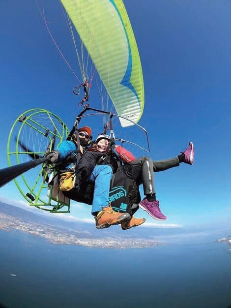 プロパイロットが操縦する2人乗りパラグライダーで、琵琶湖の上空約300mへ。