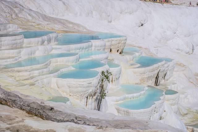 都市遺跡・ヒエラポリスとともに、「ヒエラポリス・パムッカレ」として世界遺産に登録されている「パムッカレの石灰棚」。白色の石灰成分と、ブルーの温泉のカラーコントラストがフォトジェニックなスポットです。