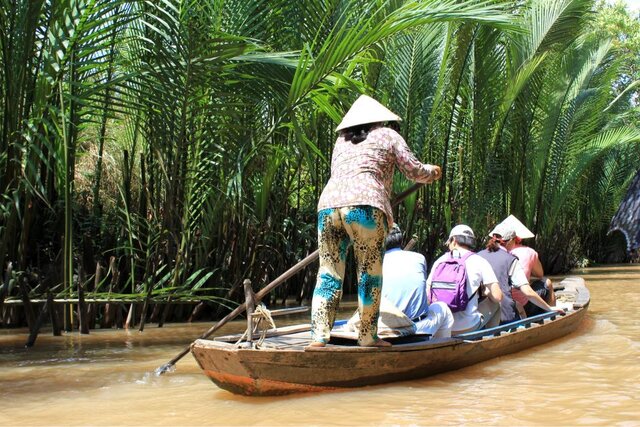 メコンデルタツアーに参加。ホーチミン市内から車で約1時間半のミトーを拠点に、手漕ぎボートでマングローブの森を進み、水上マーケットや果樹園、伝統的な村を訪れます。ユネスコ無形文化遺産の伝統民謡「ドンカータイトゥー」の鑑賞もおすすめです!
