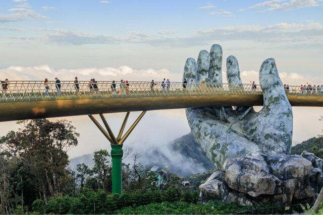 巨大な手が橋を支えるユニークなデザインが特徴。SNS映えすると人気です!