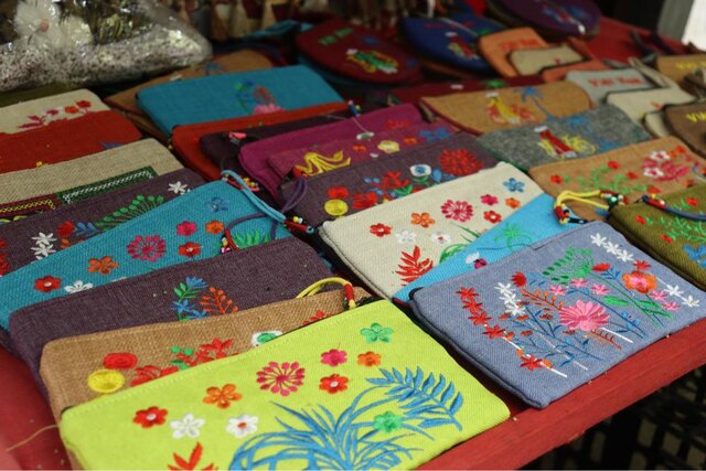 繊細な刺繍が施されたポーチや巾着袋は、女性へのお土産におすすめ!ドンスアン市場や旧市街の雑貨店で購入できます。