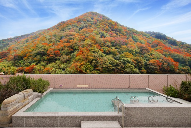 「日本の宿 古窯」は上山温泉にある宿。展望大浴場では蔵王連峰を一望しながら、しっとりとした湯ざわりの硫酸塩温泉につかれ、景色と湯の両方で癒しを満喫できます。また、冬は風情ある雪見風呂の体験も。