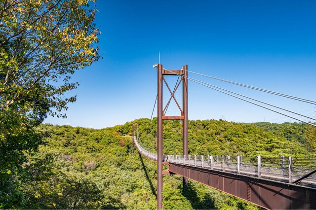 星のブランコは、緑豊かな「ほしだ園地」の森にかかる全長280mの巨大な吊り橋。地上50mの高さから見渡す景色は、まるで空を歩いているようなスリルと開放感に満ちています!