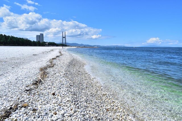 マーブルビーチは、真っ白な大理石が敷き詰められたビーチと青い海のコントラストが美しい海岸。背後には緑の松林が続き、まるで海外のリゾート地のようなフォトジェニックな絶景が広がります。