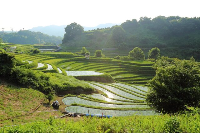 下赤阪の棚田は、大阪府で唯一の村である千早赤阪村に残る日本の原風景。山の斜面に幾重にも重なる棚田は「日本の棚田百選」にも選ばれ、どこか懐かしく温かい気持ちになる絶景です。