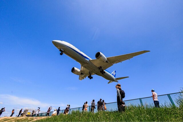 千里川土手は、伊丹空港の滑走路すぐそばに位置する絶景スポット。着陸寸前の飛行機を真下から見上げることができ、頭上をかすめるような迫力と体に響く轟音を味わえます。