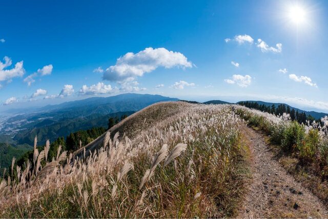 岩湧山は、自然豊かな山頂一帯に広がる広大なススキの草原が有名な山。秋になると、陽の光を浴びて黄金色に輝くススキが風になびき、幻想的な世界を作り出します。