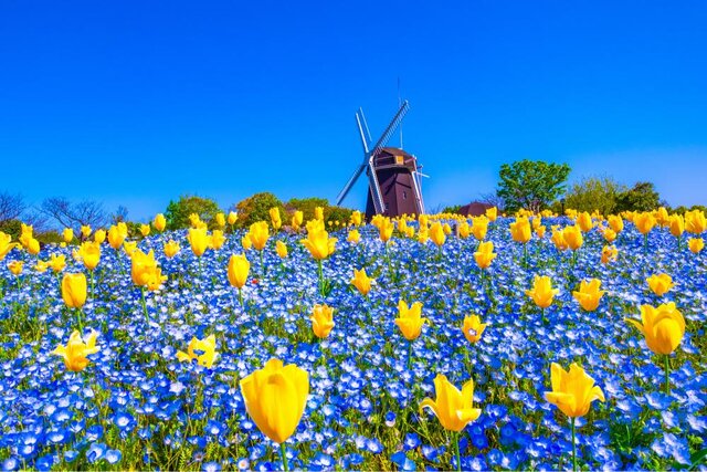 春のチューリップやネモフィラ、秋のコスモスなど、季節ごとに塗り替えられる花のじゅうたんは圧巻。青空と風車、鮮やかな花々の共演は写真映えも抜群です!