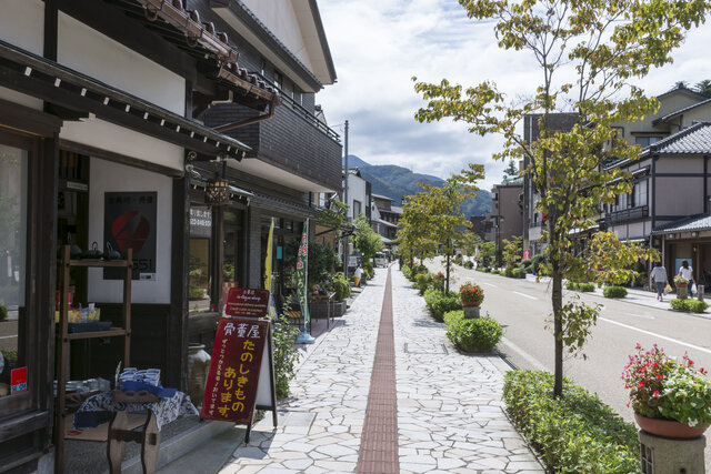 山中温泉の共同浴場「総湯」から延びるおよそ500mほどの「ゆげ街道」には、山中漆器や九谷焼のギャラリーなどが軒を連ねます。