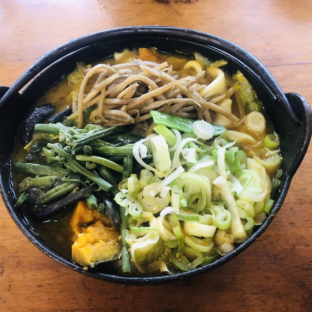 熱々の鍋で提供されるカボチャほうとうはボリューム満点です。