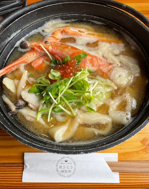 えびやカニ、イクラが乗った贅沢な海鮮ほうとうがおすすめです。