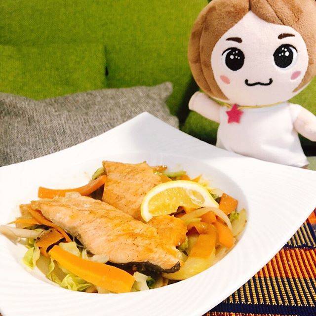 塩胡椒で下味を付けた鮭をバターで焼き目がつくまで焼いたら、その上に切った野菜をたーっぷり敷き詰めます🥕