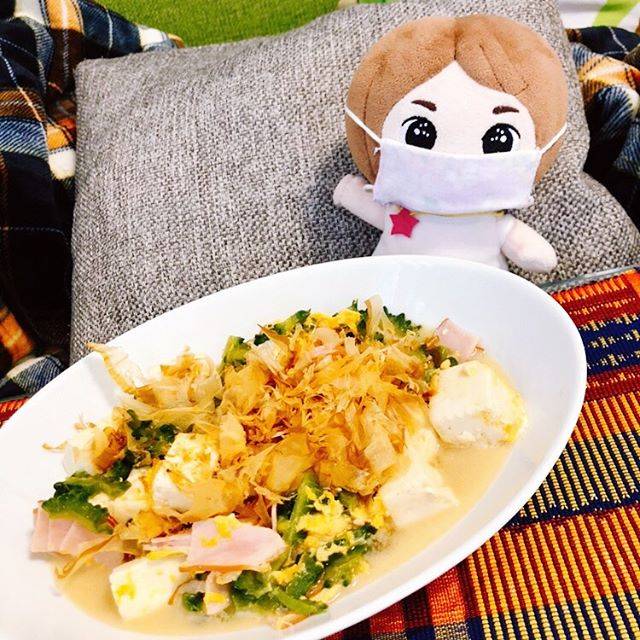 鰹節をたくさん乗っけて汁だく好きのたびーら風ゴーヤチャンプルーだよ!