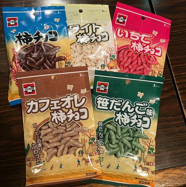 柿の種がチョコでコーティングされた柿チョコはカフェオレ、いちご・ホワイト・きなこなど、迷うほどの品揃え!