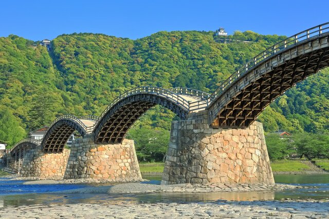 日本三名橋の一つに数えられる錦帯橋は、清流・錦川に架かる5連の木造アーチ橋。伝統の技が息づく美しい造形美が魅力で、橋の上からは城下町の風情と穏やかな川の流れを一望できます。