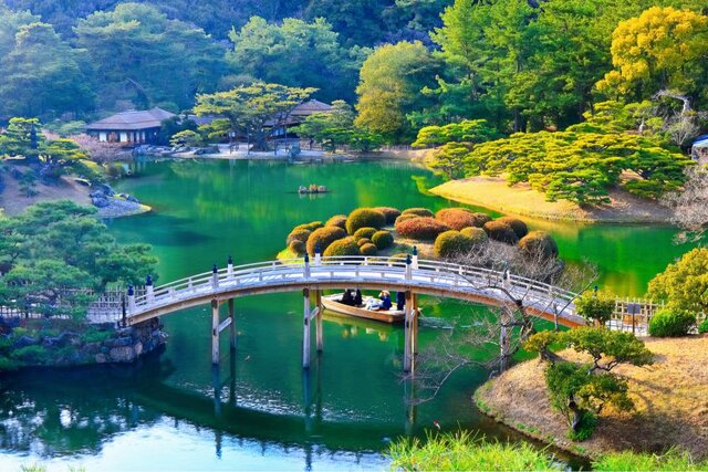 栗林公園は、6つの池と13の築山から成る江戸初期の大名庭園。「お庭の国宝」とも称され、一歩進むごとに景色が変わる「一歩一景」の美しさが楽しめます。