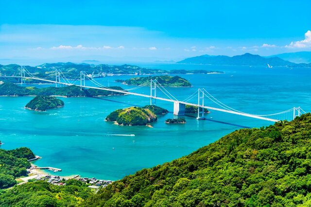 瀬戸内しまなみ海道は、大小の島々を橋で結ぶ海の道。「サイクリストの聖地」として知られ、海の上を駆け抜ける爽快感はここだけの体験です。