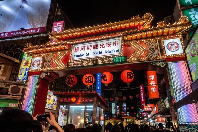 「饒河街観光夜市(ラオハージエグァングァンイェシー)」は、MRT松山駅からすぐの場所にあるアクセスしやすい夜市。入り口付近の「松山慈祐宮」は、写真映えすることでも人気です♪