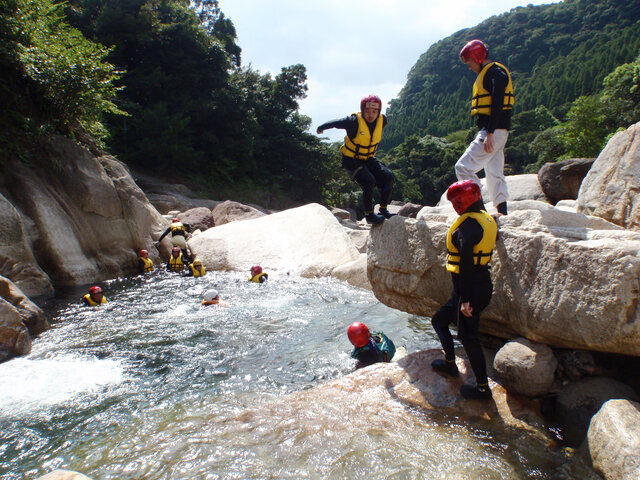 豊かな自然の猿ヶ城渓谷で、岩を乗り越えたり、よじ登ったり、滝つぼへのジャンプなど楽しいスポットを冒険感覚で進んでいきます。