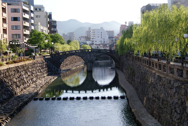 川面に映るとその橋影がまさに眼鏡のような形に見える橋、眼鏡橋。