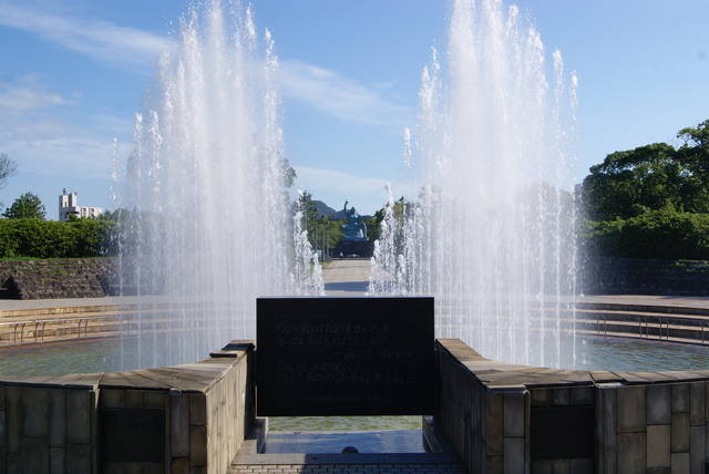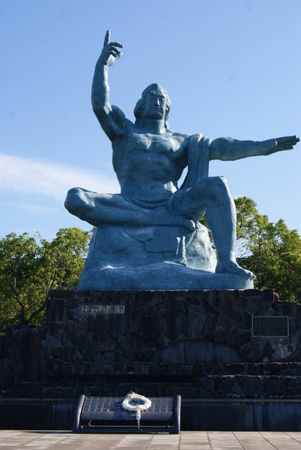 天に伸びる右手は原爆の脅威、水平に伸ばした左手は世界平和を表しています。