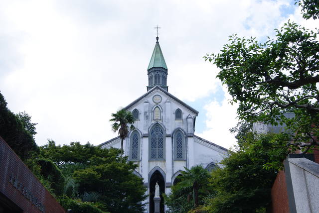 大浦天主堂は現存する日本最古の木造のゴシック様式のカトリックの教会で、聖堂内はマリア像が祭壇の右手に立ち、ステンドグラスが神々しく光っています。