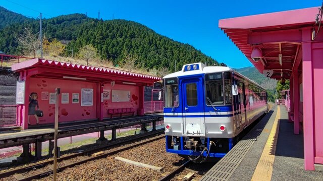 駅全体の鮮やかなピンク色と、周囲の緑や静かな山間の風景との見事なコントラストが見どころ。写真映えを狙うなら、青空の日が絶好のタイミングです!