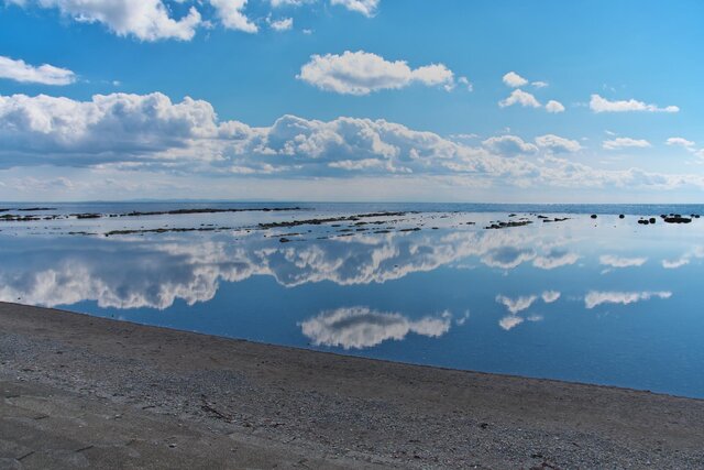 近年話題になっているのが、大崎海水浴場で見られるリフレクション。潮が引いていくと広大な水鏡が現れ、空の様子をそのまま映し出してくれます♪