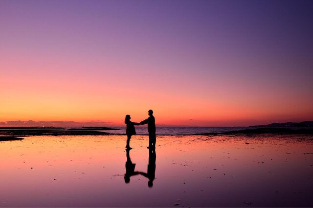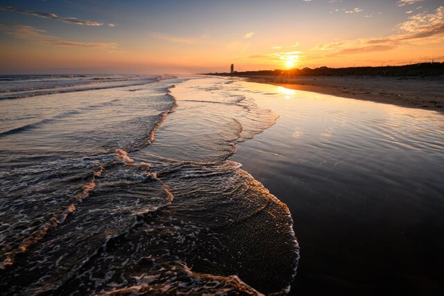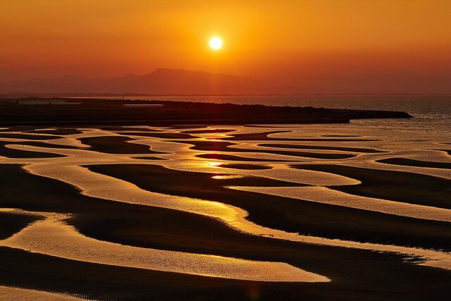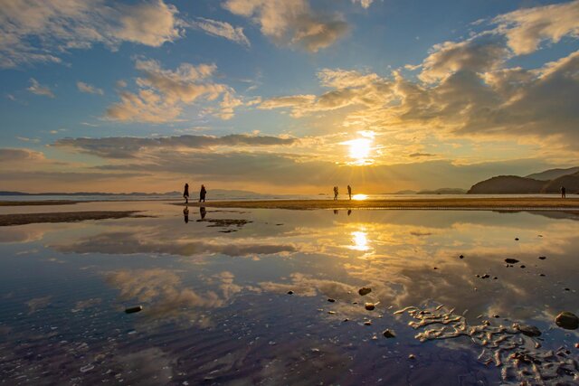 新舞子海水浴場で見られるリフレクションは、絵画のような美しさが特徴。干潮時には遠浅の海の中にところどころ砂浜が現れ、まだら模様の水鏡が出来上がります。そこに太陽の光が反射する光景は、表現し尽くせない絶景ですよ♪
