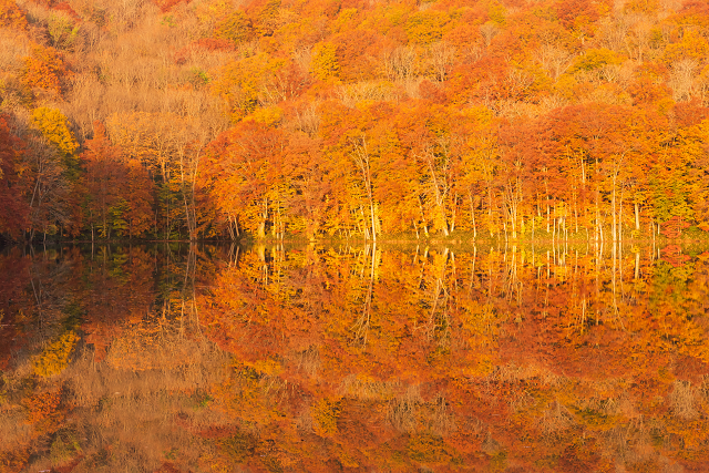 水鏡に映るのは、高々と茂る樹々がまるで水面から生えているかのような神秘的な光景。つい時がたつのを忘れて見つめてしまいます。