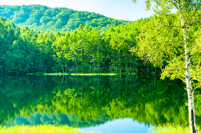 八ヶ岳中信高原国定公園にある「御射鹿池(みしゃかいけ)」は、ため池百選にも数えられ、東山魁夷の絵画のモデルにもなったという景勝地です。酸性度が強いことから水中に生物はあまり住んでおらず、高い透明度を保っています。
