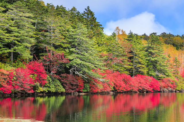 ウユニ塩湖のような水鏡の美しさが際立つのは、やはり秋の紅葉シーズンです。針葉樹と広葉樹が織り交ぜられた豊かな色彩の森は、やはり高地ならでは。訪れた方のみが楽しめる特別な光景です。