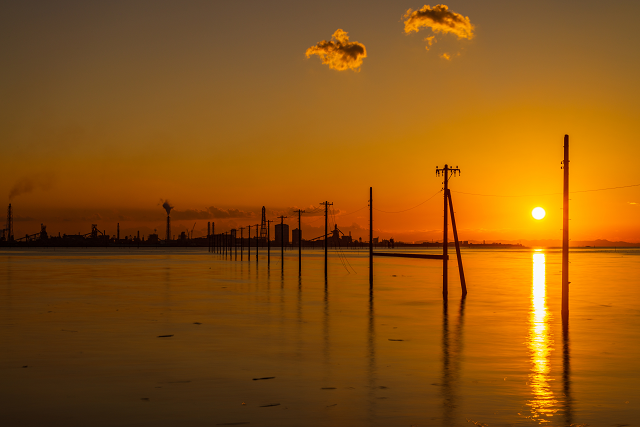 遠くに見える街や工場の光を水面に映しこみ、夕暮れ時にはまるで別世界に来たかのような不思議な景色が広がります。
