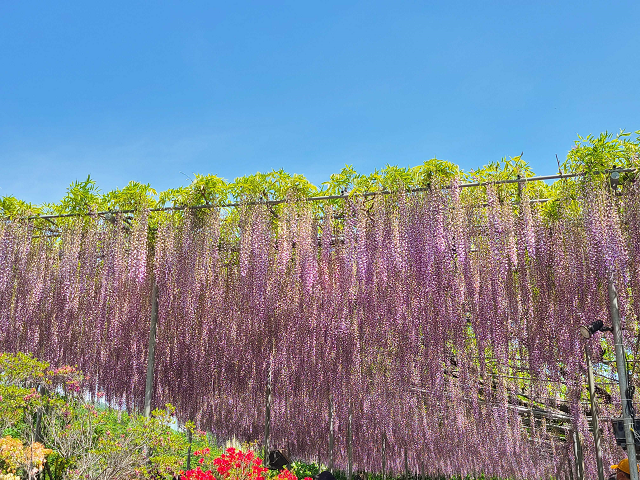 例年4月下旬〜5月中旬に藤の花が見頃を迎え、約9万4000平方メートルの広大な敷地内が紫の世界になります。