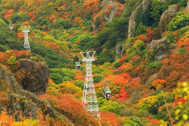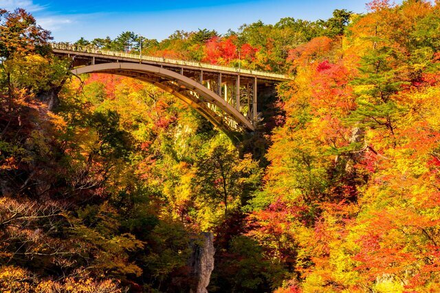 新展望台や鳴子峡レストハウス、見晴らし台からも絶景が楽しめ、高さ100mの断崖絶壁が約2.5km続くこの渓谷は、鉄道や遊歩道からの紅葉も素晴らしく、赤や黄色に染まる風景は息をのむ美しさです。