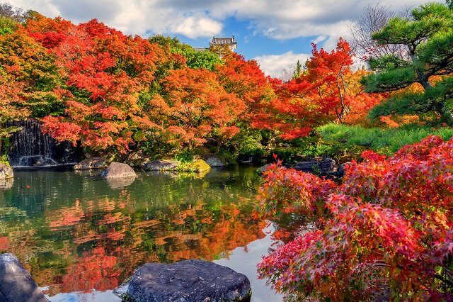 その姫路城の近くには好古園という池泉回遊式の日本庭園があり、元姫路藩主の下屋敷跡に造られ、9つの趣の異なる庭園群が広がります。