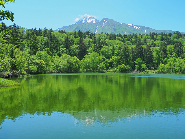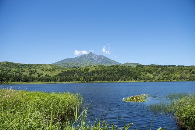 エゾマツ、トドマツがうっそうと茂り、コバルトブルーの沼の向こうには、利尻山の雄姿が眺められます。