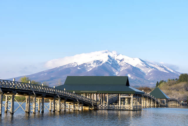 名前のとおり、鶴が羽を広げたかのような、優雅な三連太鼓橋そのものの景色も素敵ですが、橋と湖のバックに、津軽富士と称される岩木山がどっしりと構えている景色も圧巻です。